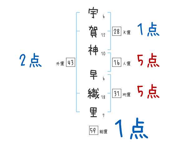 外運![]() | 宇賀神早織里さんの外運は43画の2つ星!頑固な性格で独立心が強いかも。やや非現実的で浪費に注意しましょう。 生活面を象徴する運勢です。外部から受ける影響力を表し、結婚運、家庭運や職場、環境への順応性を表します。 |