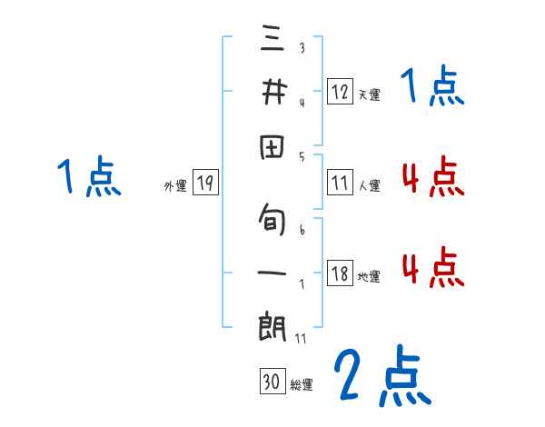 外運![]() | 三井田旬一朗さんの外運は19画の1つ星!優れた才能を持ちますが、協調性が足りないことも。周りの人と協力する事を意識しましょう。 生活面を象徴する運勢です。外部から受ける影響力を表し、結婚運、家庭運や職場、環境への順応性を表します。 |