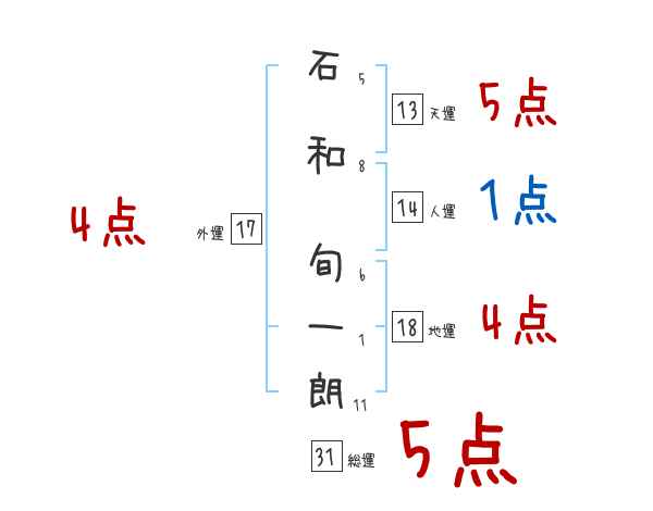 外運![]() | 石和旬一朗さんの外運は17画の4つ星!積極的な行動力。地位を気づき財産を手に入れる。純粋な心と直感力。 生活面を象徴する運勢です。外部から受ける影響力を表し、結婚運、家庭運や職場、環境への順応性を表します。 |