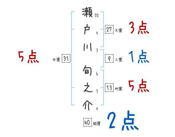 天運![]() | 瀬戸川旬之介さんの天運は27画の3つ星!頭脳明晰だが強情で摩擦が多い傾向。孤立に注意。 家系が持つ宿命的な運勢を表します。祖先から受け継いだ苗字ですので自分の力が及びません。家柄を象徴します。 |