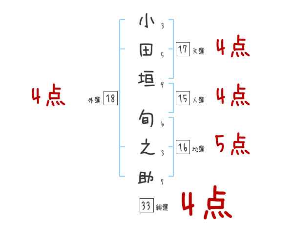 天運![]() | 小田垣旬之助さんの天運は17画の4つ星!積極的な行動力。地位を気づき財産を手に入れる。純粋な心と直感力。 家系が持つ宿命的な運勢を表します。祖先から受け継いだ苗字ですので自分の力が及びません。家柄を象徴します。 |