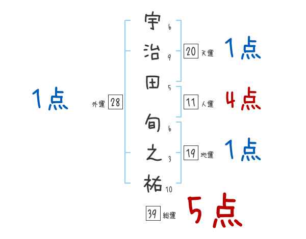 総運![]() | 宇治田旬之祐さんの総運は39画の5つ星!社交性に優れ人望が厚い。人の上に立ち成功する。 あなたの人生を表す1番重要な運勢です。生涯を通じて影響する総合運となり、主に50歳以降の晩年期に影響を及ぼします。 |