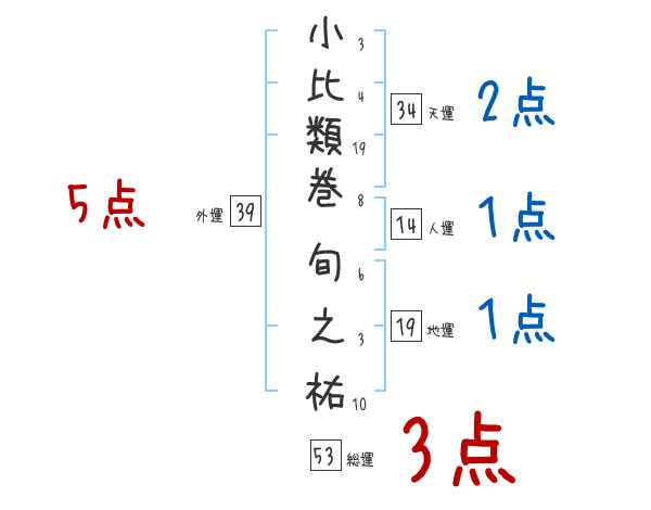 外運![]() | 小比類巻旬之祐さんの外運は39画の5つ星!社交性に優れ人望が厚い。人の上に立ち成功する。 生活面を象徴する運勢です。外部から受ける影響力を表し、結婚運、家庭運や職場、環境への順応性を表します。 |