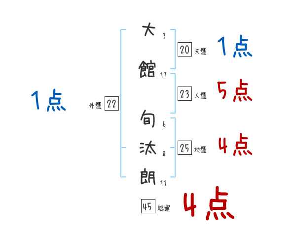 外運![]() | 大館旬汰朗さんの外運は22画の1つ星!努力することが苦手ないっぽう手先が器用。芸術性にも優れる。 生活面を象徴する運勢です。外部から受ける影響力を表し、結婚運、家庭運や職場、環境への順応性を表します。 |