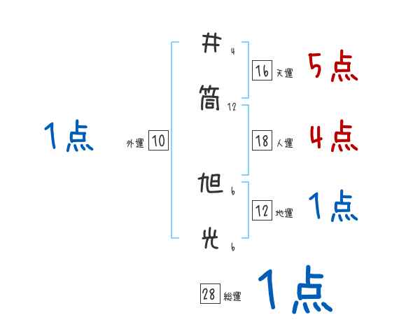 天運![]() | 井筒旭光さんの天運は16画の5つ星!人望が厚く大きく発展する。逆転成功が見える。 家系が持つ宿命的な運勢を表します。祖先から受け継いだ苗字ですので自分の力が及びません。家柄を象徴します。 |