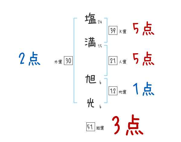天運![]() | 塩満旭光さんの天運は39画の5つ星!社交性に優れ人望が厚い。人の上に立ち成功する。 家系が持つ宿命的な運勢を表します。祖先から受け継いだ苗字ですので自分の力が及びません。家柄を象徴します。 |
