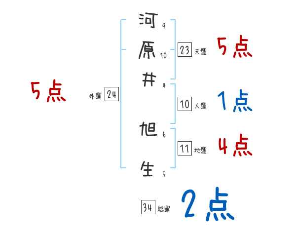 外運![]() | 河原井旭生さんの外運は24画の5つ星!家庭運が良く順調な人生。金運にも恵まれる。 生活面を象徴する運勢です。外部から受ける影響力を表し、結婚運、家庭運や職場、環境への順応性を表します。 |
