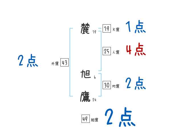 天運![]() | 麓旭鷹さんの天運は19画の1つ星!優れた才能を持ちますが、協調性が足りないことも。周りの人と協力する事を意識しましょう。 家系が持つ宿命的な運勢を表します。祖先から受け継いだ苗字ですので自分の力が及びません。家柄を象徴します。 |