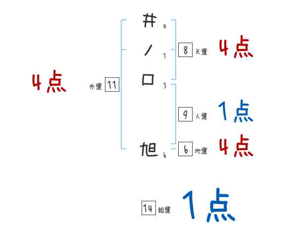 総運![]() | 井ノ口旭さんの総運は14画の1つ星!人に対して優しいがストレスを溜め込みがち。人間関係のトラブルを避けるよう気をつけましょう。 あなたの人生を表す1番重要な運勢です。生涯を通じて影響する総合運となり、主に50歳以降の晩年期に影響を及ぼします。 |