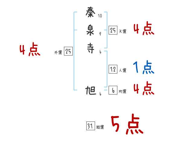 天運![]() | 秦泉寺旭さんの天運は25画の4つ星!個性があり才能があふれる。強運の持ち主で発展する。 家系が持つ宿命的な運勢を表します。祖先から受け継いだ苗字ですので自分の力が及びません。家柄を象徴します。 |