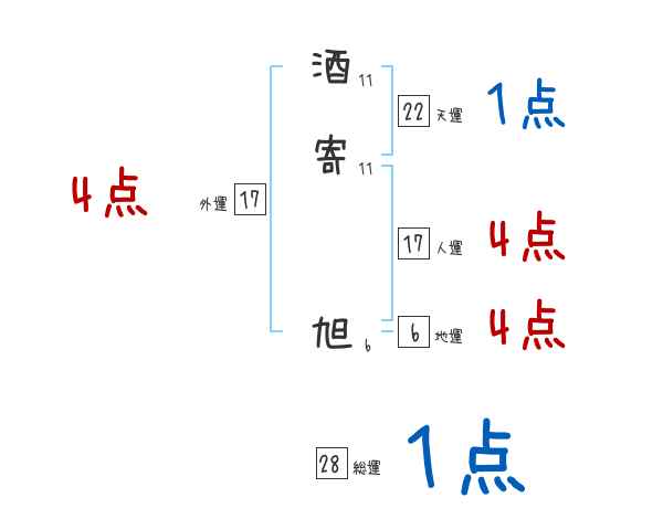 外運![]() | 酒寄旭さんの外運は17画の4つ星!積極的な行動力。地位を気づき財産を手に入れる。純粋な心と直感力。 生活面を象徴する運勢です。外部から受ける影響力を表し、結婚運、家庭運や職場、環境への順応性を表します。 |