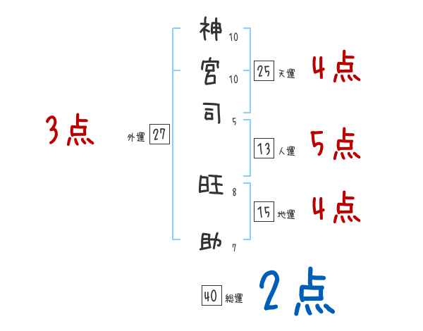 天運![]() | 神宮司旺助さんの天運は25画の4つ星!個性があり才能があふれる。強運の持ち主で発展する。 家系が持つ宿命的な運勢を表します。祖先から受け継いだ苗字ですので自分の力が及びません。家柄を象徴します。 |