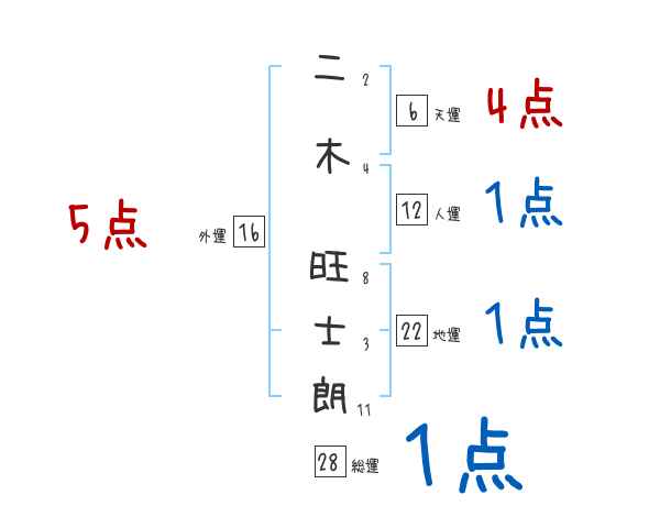 地運![]() | 二木旺士朗さんの地運は22画の1つ星!努力することが苦手ないっぽう手先が器用。芸術性にも優れる。 個性を表す基礎的な運勢です。性格形成や対人関係、行動力など家庭環境に影響されます。主に誕生してから20歳くらいまでの若年期の運勢を表します。 |