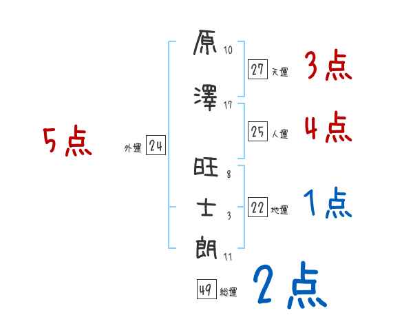 天運![]() | 原澤旺士朗さんの天運は27画の3つ星!頭脳明晰だが強情で摩擦が多い傾向。孤立に注意。 家系が持つ宿命的な運勢を表します。祖先から受け継いだ苗字ですので自分の力が及びません。家柄を象徴します。 |