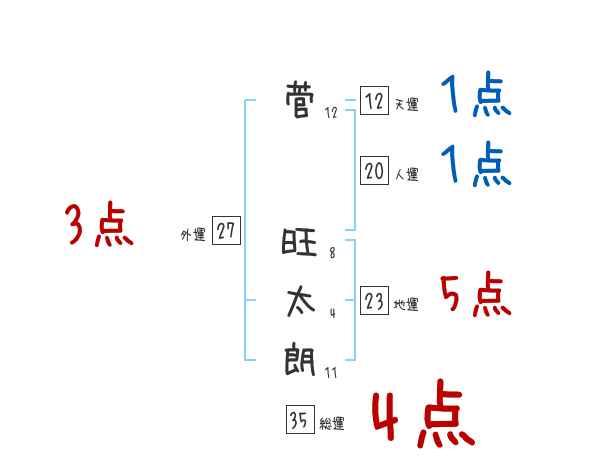 外運![]() | 菅旺太朗さんの外運は27画の3つ星!頭脳明晰だが強情で摩擦が多い傾向。孤立に注意。 生活面を象徴する運勢です。外部から受ける影響力を表し、結婚運、家庭運や職場、環境への順応性を表します。 |
