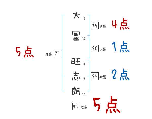 外運![]() | 大冨旺志朗さんの外運は21画の5つ星!統率力がある。独立し成功する。名誉を手に入れる。 生活面を象徴する運勢です。外部から受ける影響力を表し、結婚運、家庭運や職場、環境への順応性を表します。 |