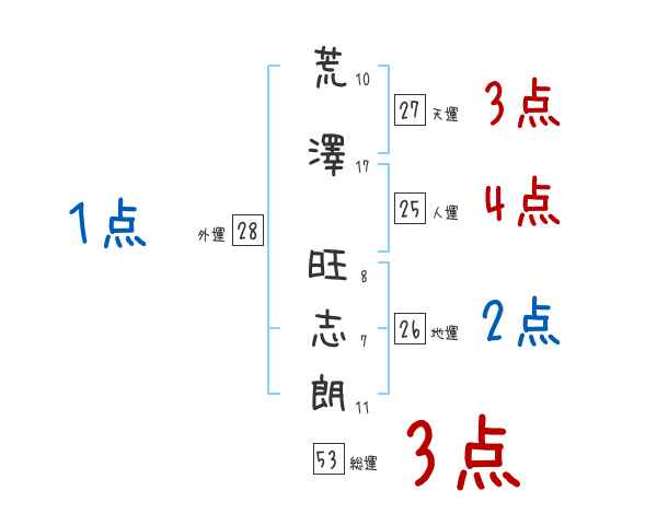 総運![]() | 荒澤旺志朗さんの総運は53画の3つ星!やや見栄っ張りで虚栄心がある。散財に注意。 あなたの人生を表す1番重要な運勢です。生涯を通じて影響する総合運となり、主に50歳以降の晩年期に影響を及ぼします。 |