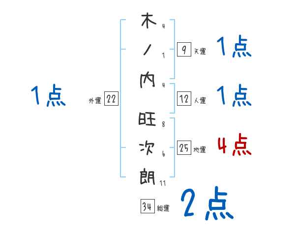 外運![]() | 木ノ内旺次朗さんの外運は22画の1つ星!努力することが苦手ないっぽう手先が器用。芸術性にも優れる。 生活面を象徴する運勢です。外部から受ける影響力を表し、結婚運、家庭運や職場、環境への順応性を表します。 |