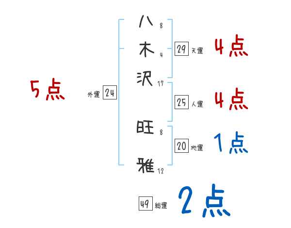 天運![]() | 八木沢旺雅さんの天運は29画の4つ星!完全主義で才能がある。厳格な心の持ち主。 家系が持つ宿命的な運勢を表します。祖先から受け継いだ苗字ですので自分の力が及びません。家柄を象徴します。 |