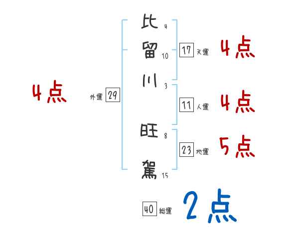 外運![]() | 比留川旺駕さんの外運は29画の4つ星!完全主義で才能がある。厳格な心の持ち主。 生活面を象徴する運勢です。外部から受ける影響力を表し、結婚運、家庭運や職場、環境への順応性を表します。 |