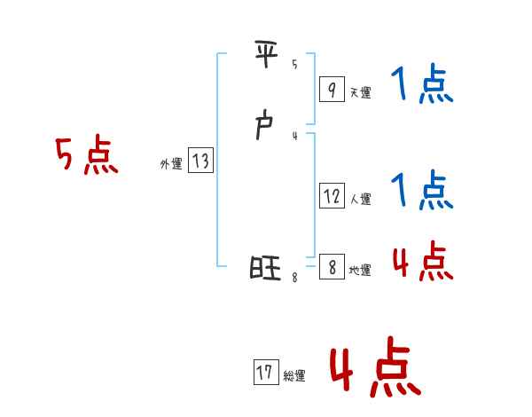 外運![]() | 平戸旺さんの外運は13画の5つ星!才能に恵まれ人気がある。名声を手に入れる。円満な人生。 生活面を象徴する運勢です。外部から受ける影響力を表し、結婚運、家庭運や職場、環境への順応性を表します。 |