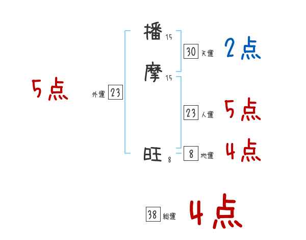 人運![]() | 播摩旺さんの人運は23画の5つ星!想像力に優れ活力がある。一代で成功し名誉を手に入れる。 性格や才能などを表す2番目に重要な運勢です。人間関係や協調性、社会的な成功に影響します。主に20歳から50歳ぐらいまでの中年期の運勢を表します。 |