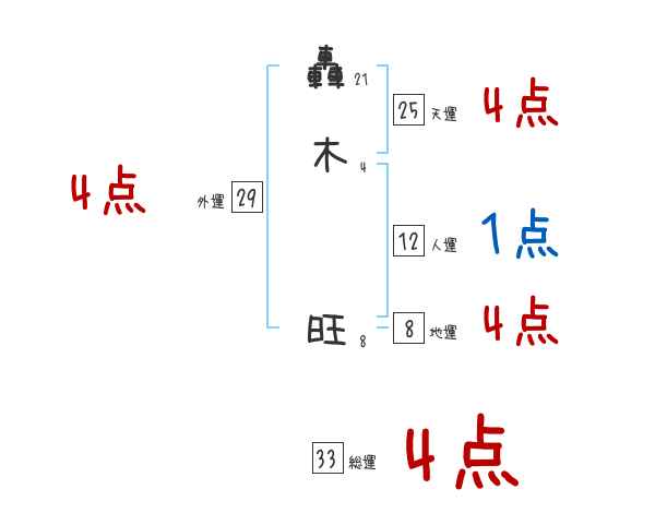 外運![]() | 轟木旺さんの外運は29画の4つ星!完全主義で才能がある。厳格な心の持ち主。 生活面を象徴する運勢です。外部から受ける影響力を表し、結婚運、家庭運や職場、環境への順応性を表します。 |