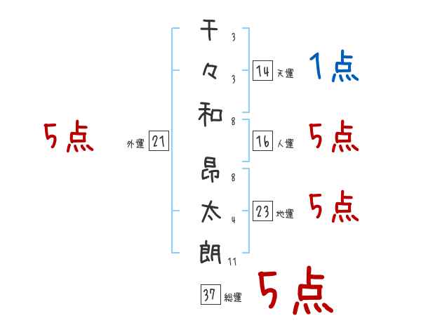 人運![]() | 千々和昂太朗さんの人運は16画の5つ星!人望が厚く大きく発展する。逆転成功が見える。 性格や才能などを表す2番目に重要な運勢です。人間関係や協調性、社会的な成功に影響します。主に20歳から50歳ぐらいまでの中年期の運勢を表します。 |