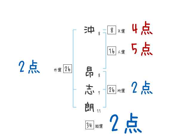 天運![]() | 沖昂志朗さんの天運は8画の4つ星!勤勉家。根気強く努力し成功する。忍耐力がある。 家系が持つ宿命的な運勢を表します。祖先から受け継いだ苗字ですので自分の力が及びません。家柄を象徴します。 |