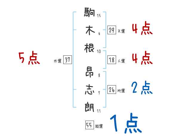 外運![]() | 駒木根昂志朗さんの外運は37画の5つ星!努力家で順応性に優れる。現実的な考え方ができ忠実に物事をこなす。 生活面を象徴する運勢です。外部から受ける影響力を表し、結婚運、家庭運や職場、環境への順応性を表します。 |