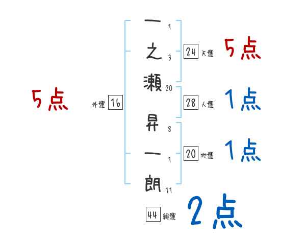 総運![]() | 一之瀬昇一朗さんの総運は44画の2つ星!誠実で慎重な性格。物事を考えすぎないように注意しましょう。 あなたの人生を表す1番重要な運勢です。生涯を通じて影響する総合運となり、主に50歳以降の晩年期に影響を及ぼします。 |