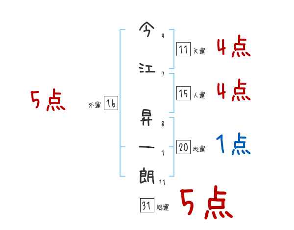 外運![]() | 今江昇一朗さんの外運は16画の5つ星!人望が厚く大きく発展する。逆転成功が見える。 生活面を象徴する運勢です。外部から受ける影響力を表し、結婚運、家庭運や職場、環境への順応性を表します。 |