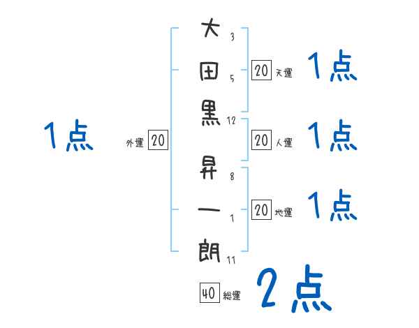 総運![]() | 大田黒昇一朗さんの総運は40画の2つ星!自信過剰で物事に固執するためトラブルに注意。 あなたの人生を表す1番重要な運勢です。生涯を通じて影響する総合運となり、主に50歳以降の晩年期に影響を及ぼします。 |