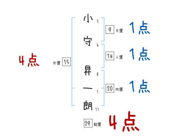 天運![]() | 小守昇一朗さんの天運は9画の1つ星!消極的で才能を発揮することが苦手なことも。周りの意見に耳を傾けましょう。 家系が持つ宿命的な運勢を表します。祖先から受け継いだ苗字ですので自分の力が及びません。家柄を象徴します。 |