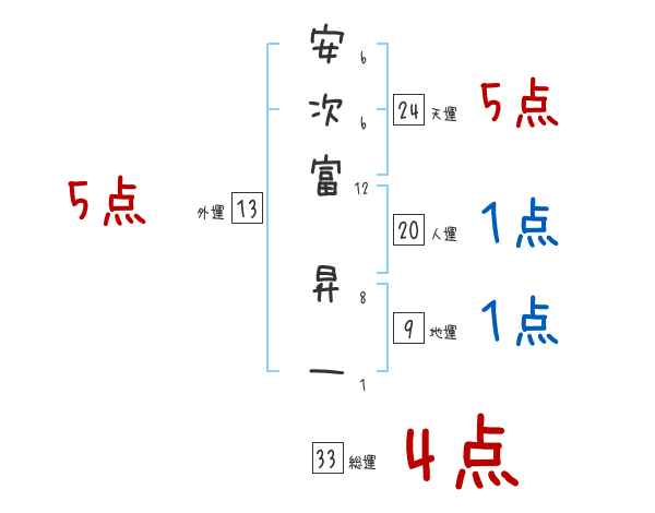 天運![]() | 安次富昇一さんの天運は24画の5つ星!家庭運が良く順調な人生。金運にも恵まれる。 家系が持つ宿命的な運勢を表します。祖先から受け継いだ苗字ですので自分の力が及びません。家柄を象徴します。 |