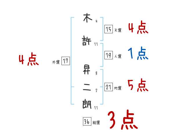 総運![]() | 木許昇二朗さんの総運は36画の3つ星!先見性が豊かです。多少神経質で苦労することも。 あなたの人生を表す1番重要な運勢です。生涯を通じて影響する総合運となり、主に50歳以降の晩年期に影響を及ぼします。 |
