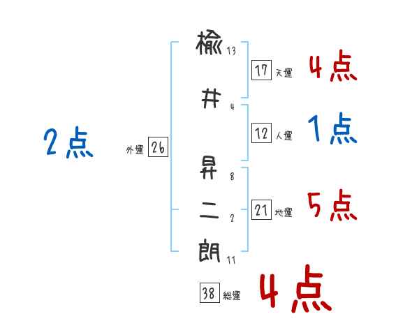 外運![]() | 楡井昇二朗さんの外運は26画の2つ星!波瀾万丈かも。信頼できる人を大事にしましょう。 生活面を象徴する運勢です。外部から受ける影響力を表し、結婚運、家庭運や職場、環境への順応性を表します。 |