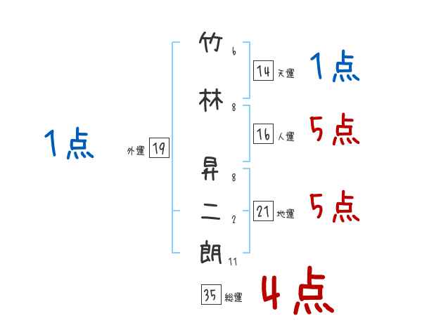 天運![]() | 竹林昇二朗さんの天運は14画の1つ星!人に対して優しいがストレスを溜め込みがち。人間関係のトラブルを避けるよう気をつけましょう。 家系が持つ宿命的な運勢を表します。祖先から受け継いだ苗字ですので自分の力が及びません。家柄を象徴します。 |