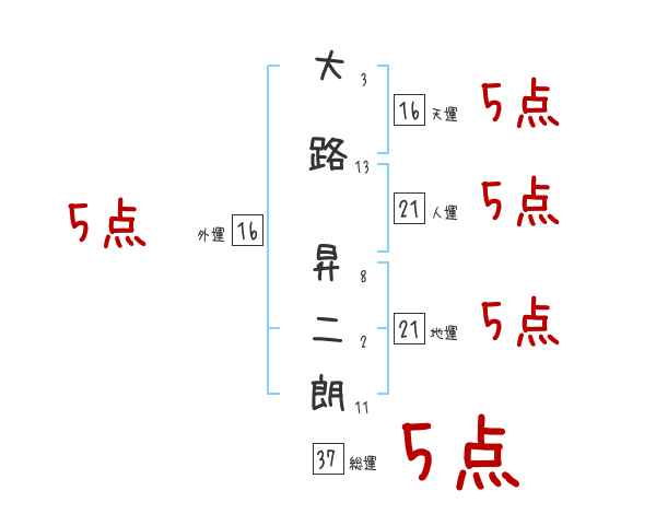 外運![]() | 大路昇二朗さんの外運は16画の5つ星!人望が厚く大きく発展する。逆転成功が見える。 生活面を象徴する運勢です。外部から受ける影響力を表し、結婚運、家庭運や職場、環境への順応性を表します。 |