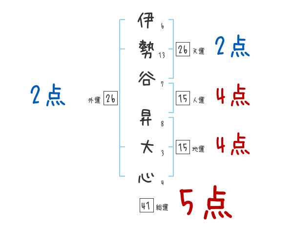 天運![]() | 伊勢谷昇大心さんの天運は26画の2つ星!波瀾万丈かも。信頼できる人を大事にしましょう。 家系が持つ宿命的な運勢を表します。祖先から受け継いだ苗字ですので自分の力が及びません。家柄を象徴します。 |