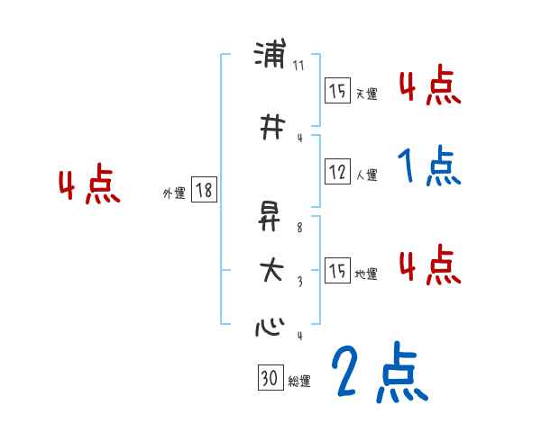外運![]() | 浦井昇大心さんの外運は18画の4つ星!情熱的で剛気。忍耐力があり信頼される。 生活面を象徴する運勢です。外部から受ける影響力を表し、結婚運、家庭運や職場、環境への順応性を表します。 |