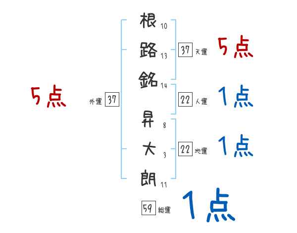 外運![]() | 根路銘昇大朗さんの外運は37画の5つ星!努力家で順応性に優れる。現実的な考え方ができ忠実に物事をこなす。 生活面を象徴する運勢です。外部から受ける影響力を表し、結婚運、家庭運や職場、環境への順応性を表します。 |