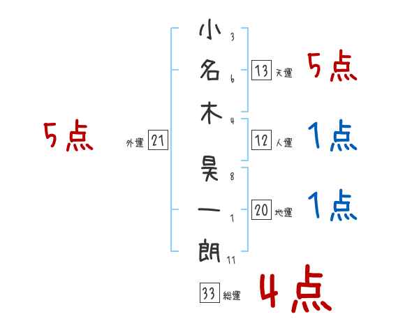 外運![]() | 小名木昊一朗さんの外運は21画の5つ星!統率力がある。独立し成功する。名誉を手に入れる。 生活面を象徴する運勢です。外部から受ける影響力を表し、結婚運、家庭運や職場、環境への順応性を表します。 |