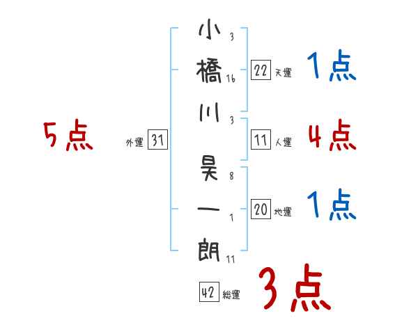 人運![]() | 小橋川昊一朗さんの人運は11画の4つ星!着実に富や地位を得る幸運な人生。 性格や才能などを表す2番目に重要な運勢です。人間関係や協調性、社会的な成功に影響します。主に20歳から50歳ぐらいまでの中年期の運勢を表します。 |