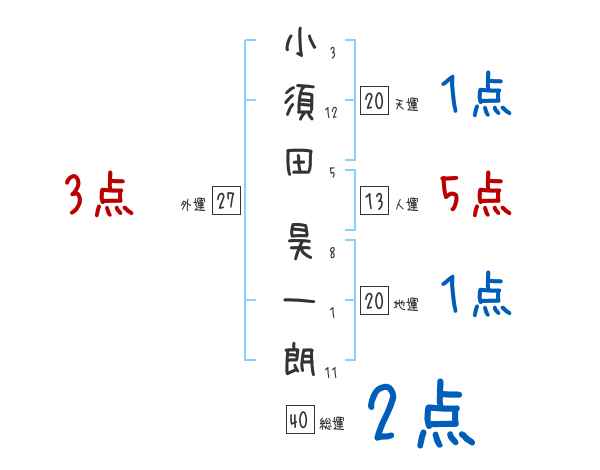 外運![]() | 小須田昊一朗さんの外運は27画の3つ星!頭脳明晰だが強情で摩擦が多い傾向。孤立に注意。 生活面を象徴する運勢です。外部から受ける影響力を表し、結婚運、家庭運や職場、環境への順応性を表します。 |