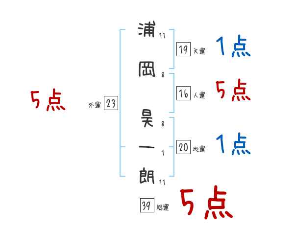 外運![]() | 浦岡昊一朗さんの外運は23画の5つ星!想像力に優れ活力がある。一代で成功し名誉を手に入れる。 生活面を象徴する運勢です。外部から受ける影響力を表し、結婚運、家庭運や職場、環境への順応性を表します。 |