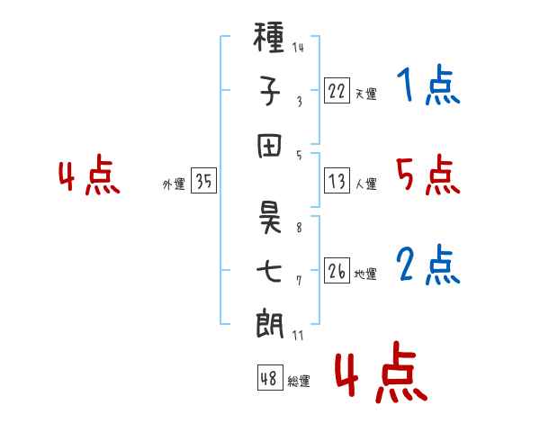 外運![]() | 種子田昊七朗さんの外運は35画の4つ星!温厚な性格で感受性が高い。穏和な性格で人望が厚い。 生活面を象徴する運勢です。外部から受ける影響力を表し、結婚運、家庭運や職場、環境への順応性を表します。 |