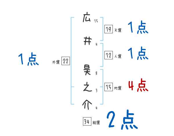 天運![]() | 広井昊之介さんの天運は19画の1つ星!優れた才能を持ちますが、協調性が足りないことも。周りの人と協力する事を意識しましょう。 家系が持つ宿命的な運勢を表します。祖先から受け継いだ苗字ですので自分の力が及びません。家柄を象徴します。 |
