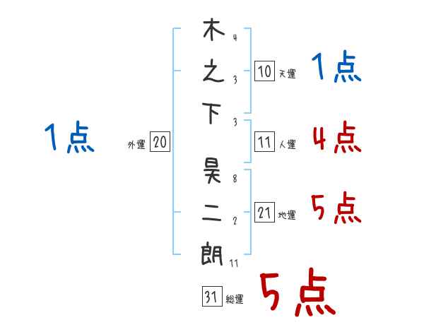 天運![]() | 木之下昊二朗さんの天運は10画の1つ星!不安を感じやすい傾向。ストレスを抱えないように注意しましょう。 家系が持つ宿命的な運勢を表します。祖先から受け継いだ苗字ですので自分の力が及びません。家柄を象徴します。 |