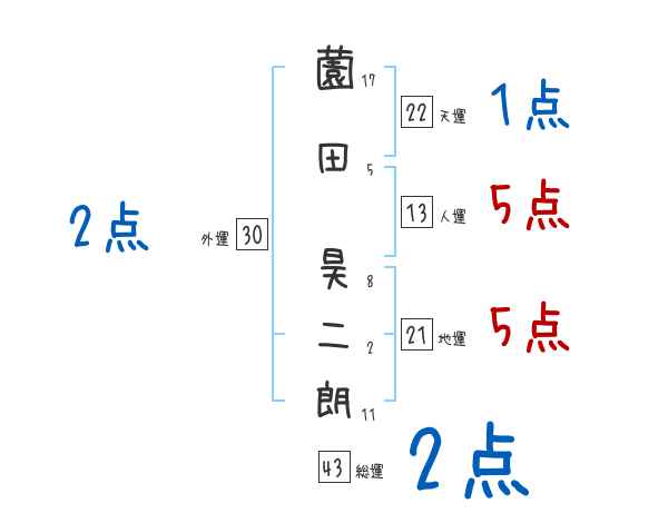 総運![]() | 薗田昊二朗さんの総運は43画の2つ星!頑固な性格で独立心が強いかも。やや非現実的で浪費に注意しましょう。 あなたの人生を表す1番重要な運勢です。生涯を通じて影響する総合運となり、主に50歳以降の晩年期に影響を及ぼします。 |